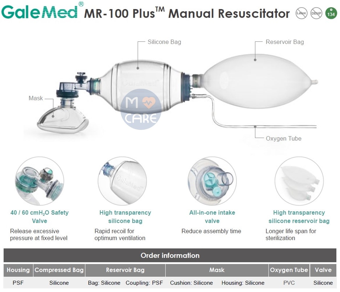 ชุดช่วยหายใจชนิดมือบีบสำหรับเด็กเล็ก MR-100 PLUS RESUSCITATOR, INFANT, W/POP-OFF 40 CM H2O W/MASK NO.0 (GAL-2152)